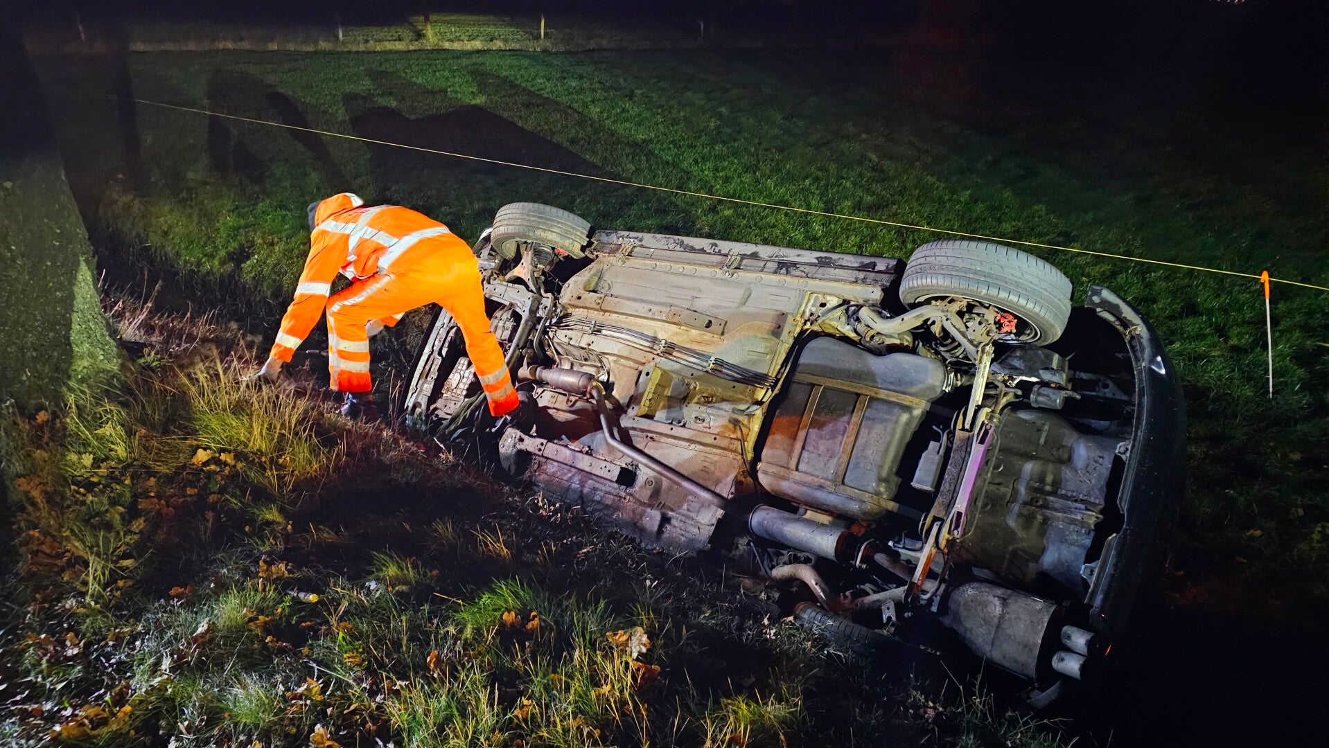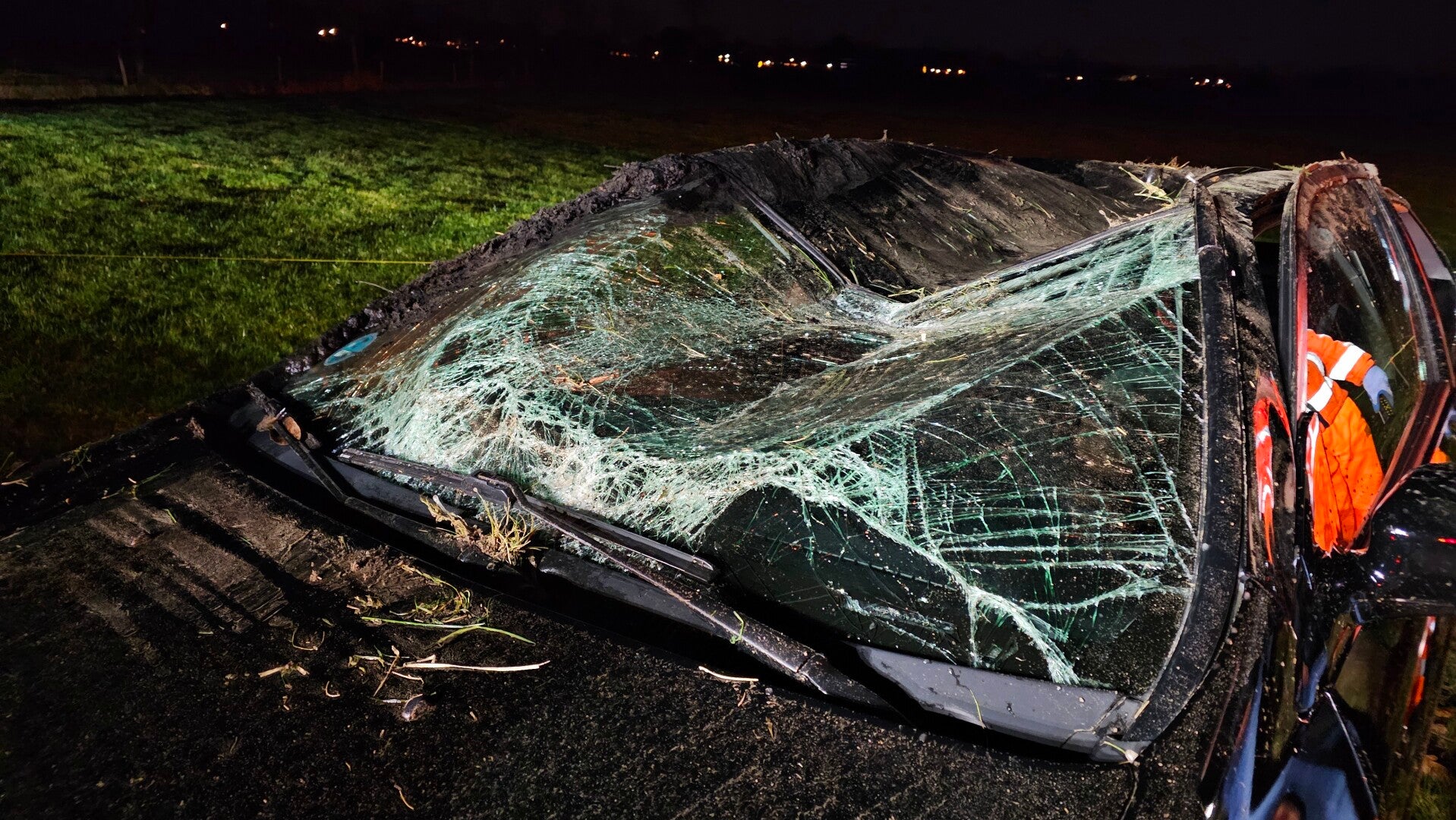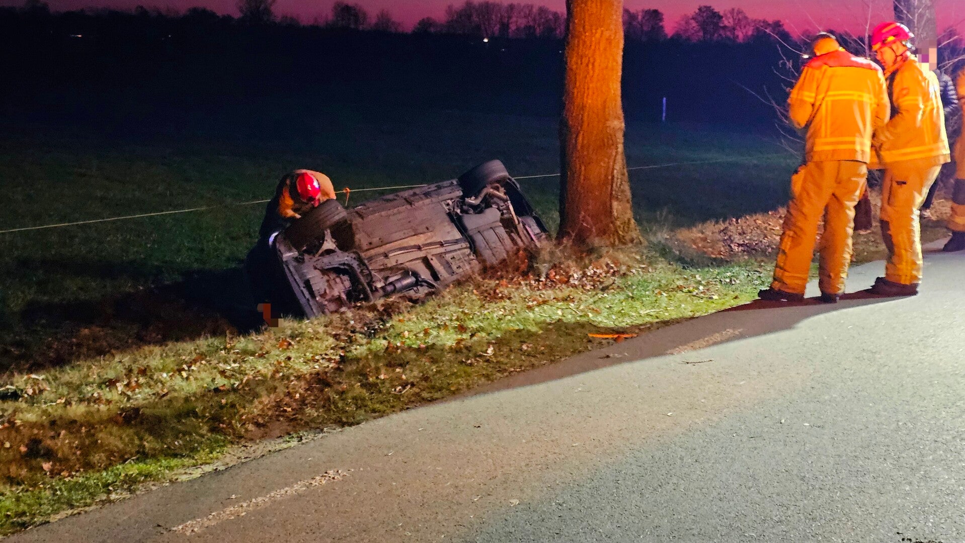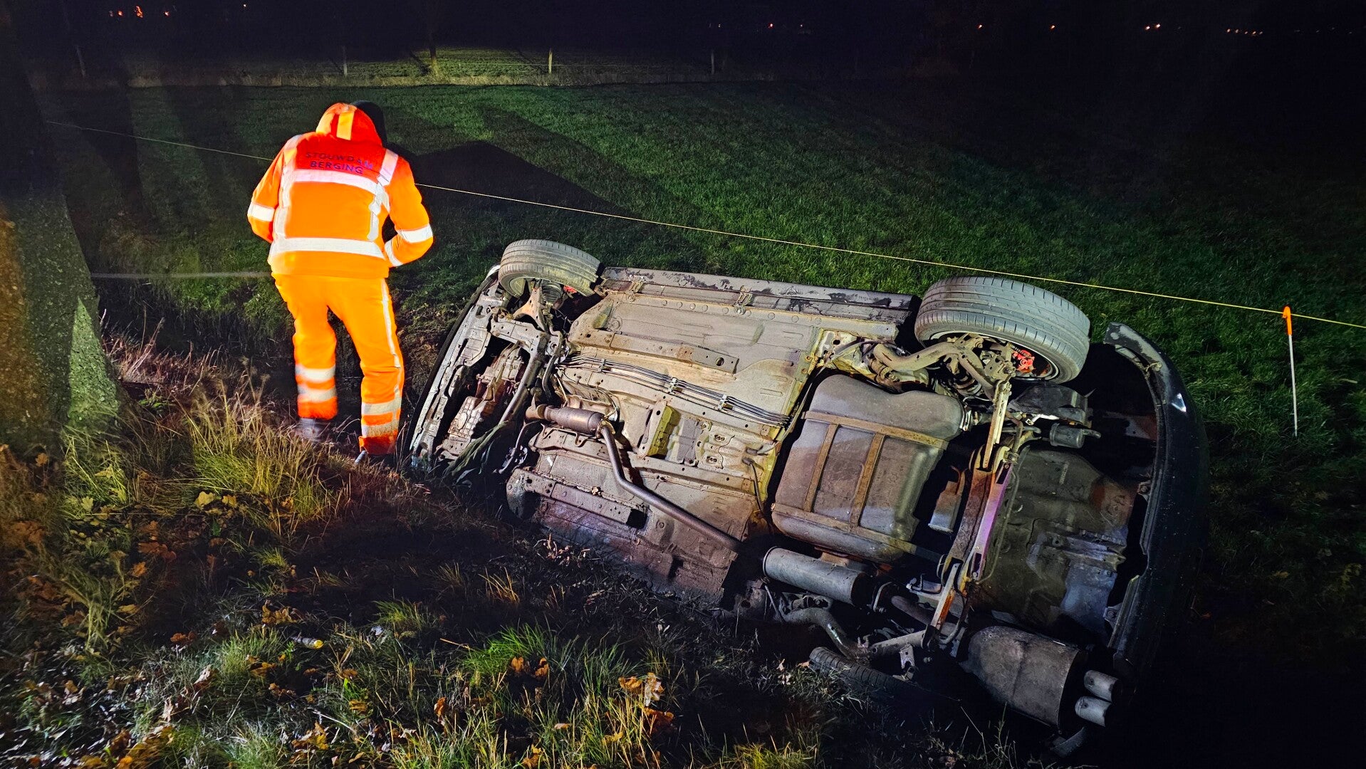 Een bestuurder verloor daar even daarvoor de macht over het stuur, waarna zijn auto in een sloot/greppel terechtkwam en uiteindelijk op de zijkant belandde.
