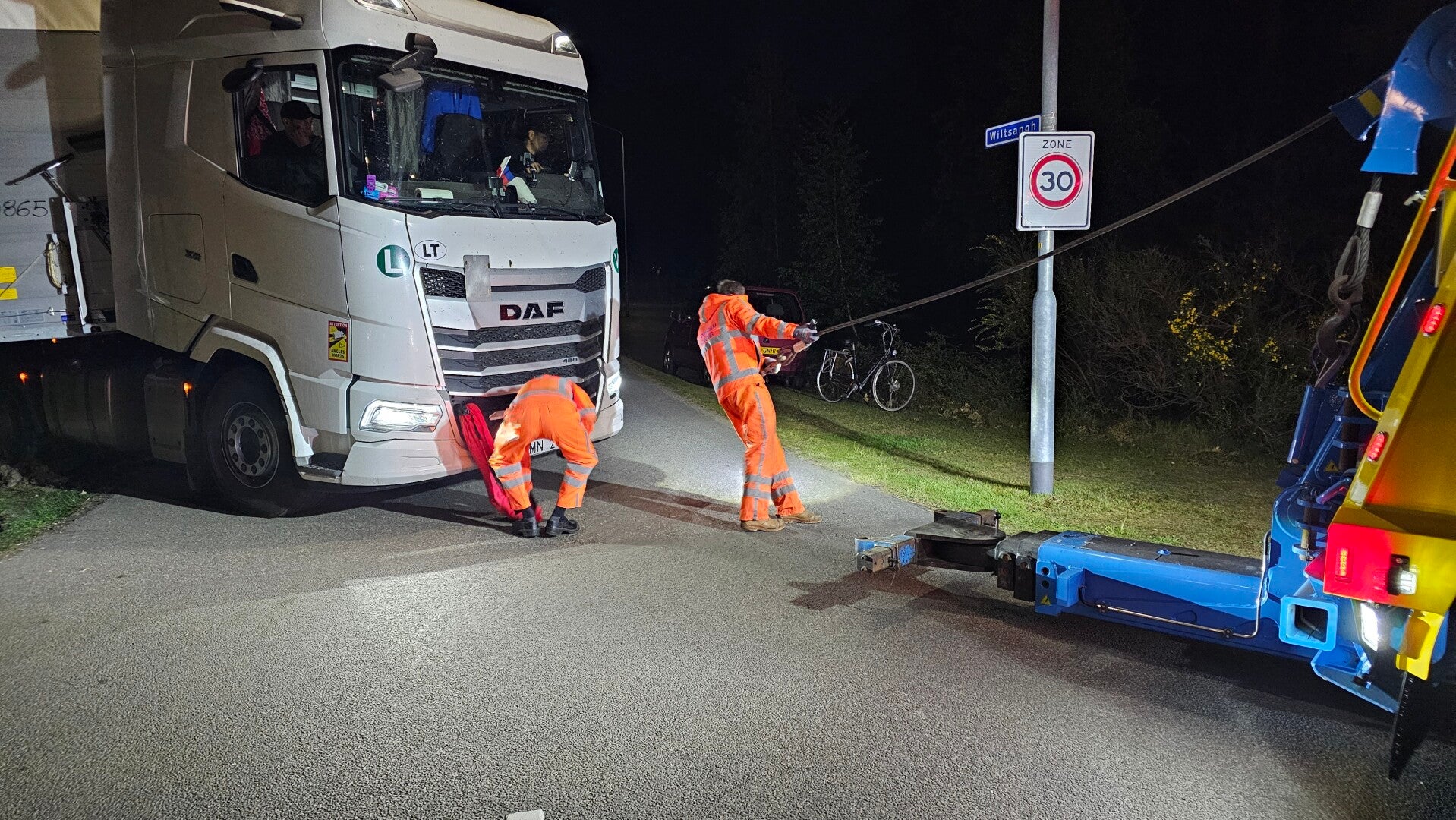 De bestuurder raakte gedesoriënteerd doordat de Eperweg volledig is afgesloten als gevolg van de aanhoudende natuurbrand in de regio. Bij een poging om te draaien op de toegangsweg van de camping, kwamen de wielen van het voertuig vast te zitten in de losse ondergrond. De vrachtwagen kon vervolgens niet meer op eigen kracht loskomen.